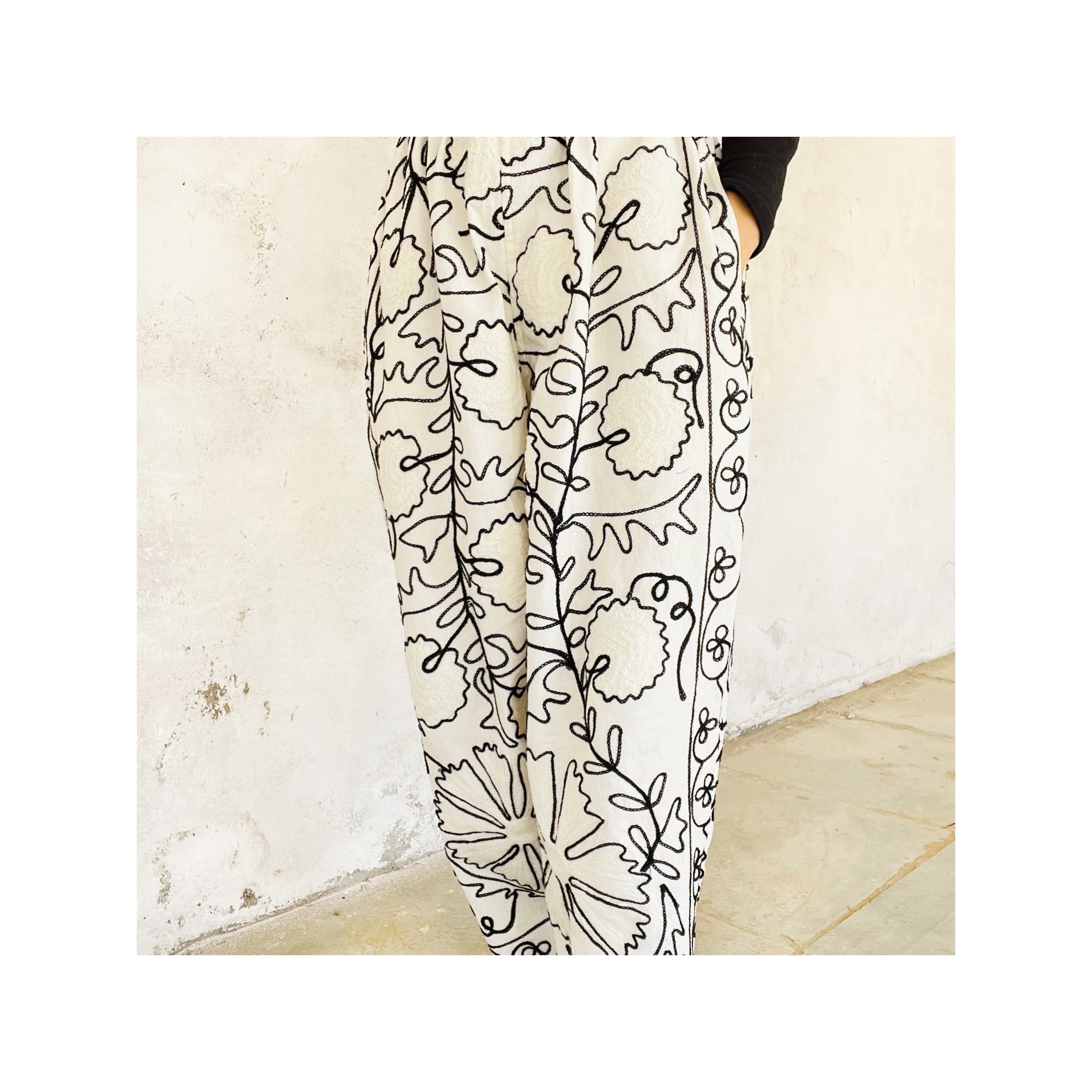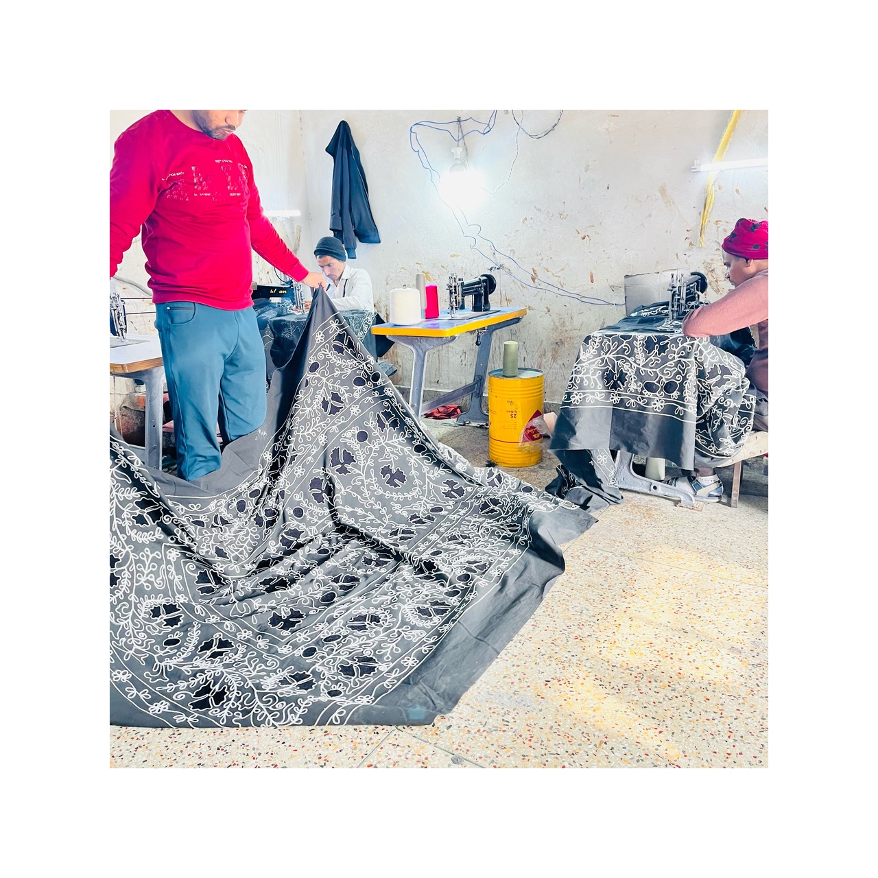刺繍用ミシンで作られた新しいスザニですが、細かいデザインが特徴でベッドカバーサイズの生地を仕上げるのに丸1日かかります。
