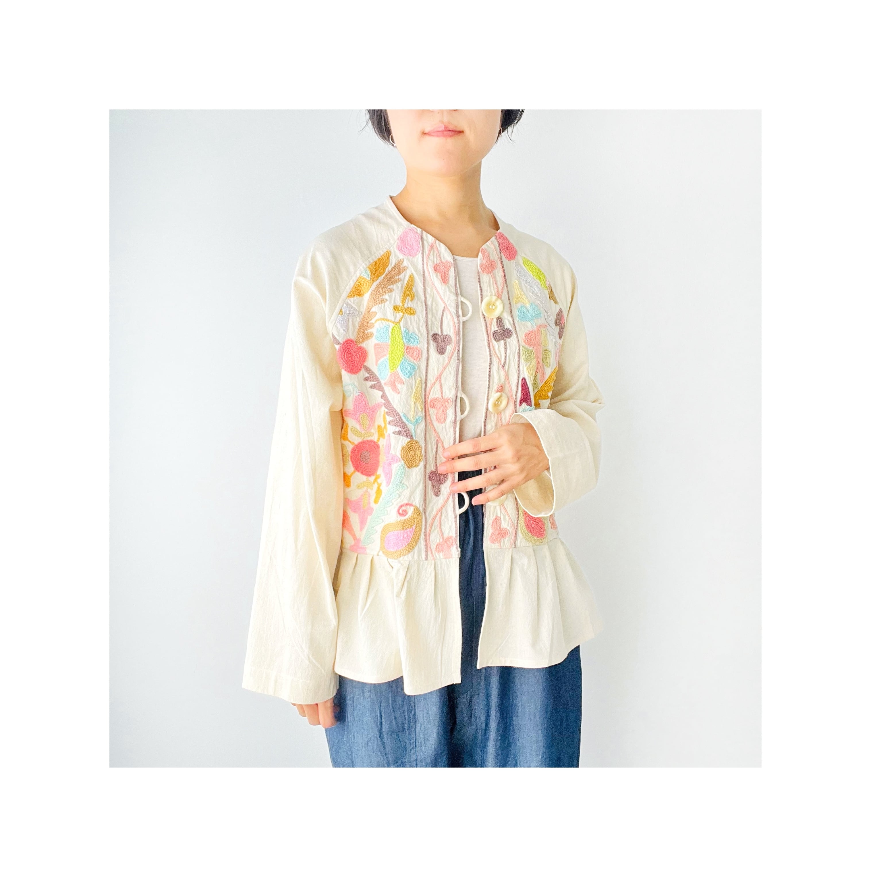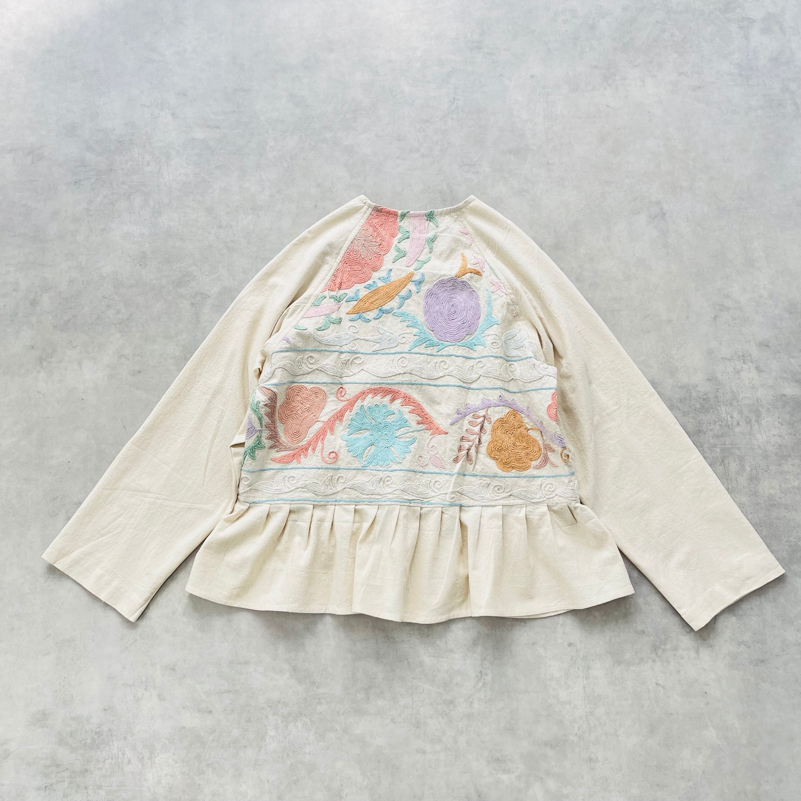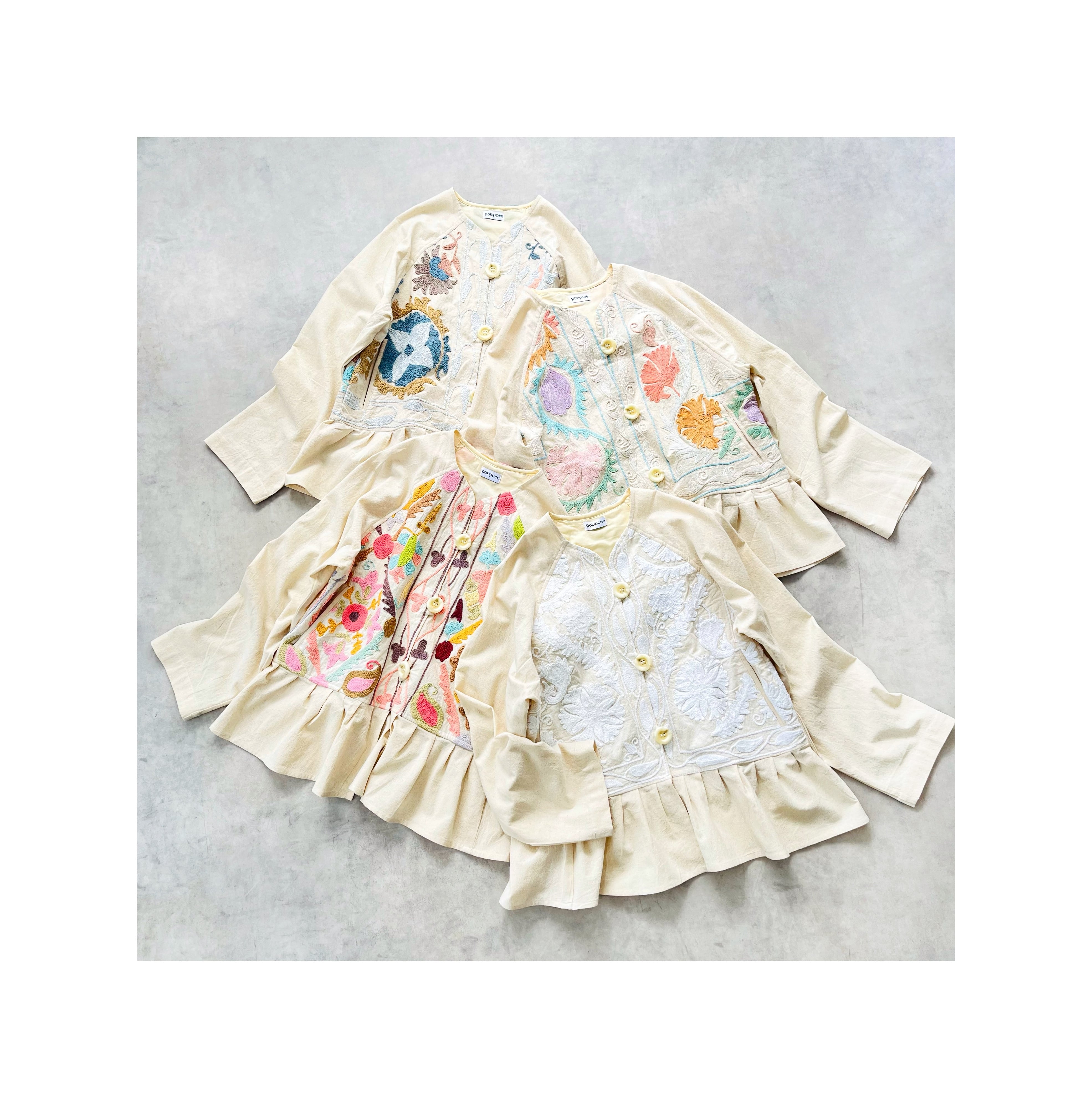 手刺繍スザニ生地に、袖と裾のギャザーは無地の生地を使用して軽くて使いやすい1着に仕上がりました。