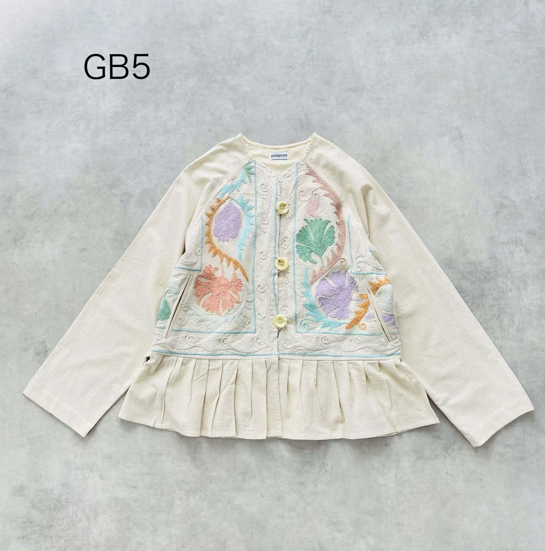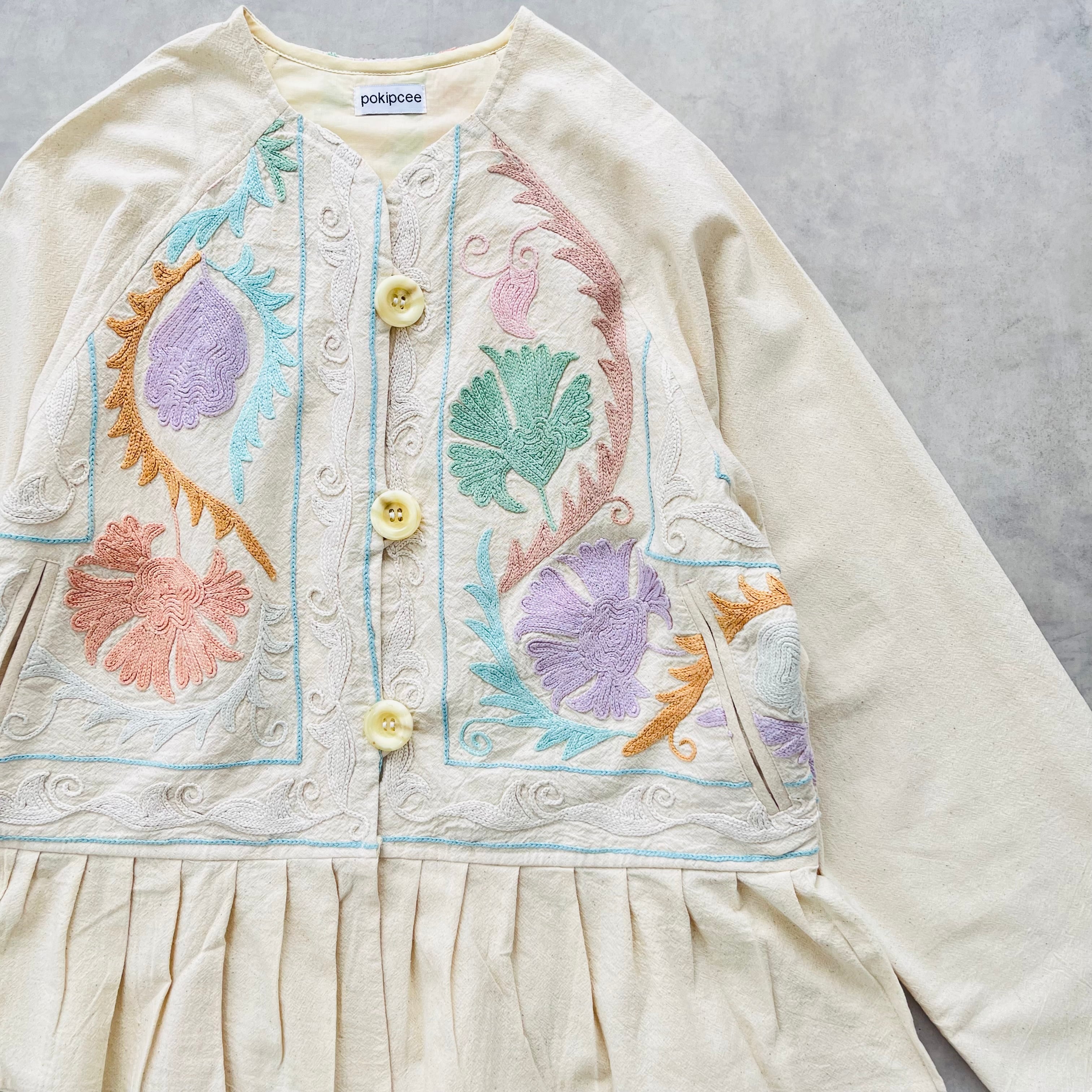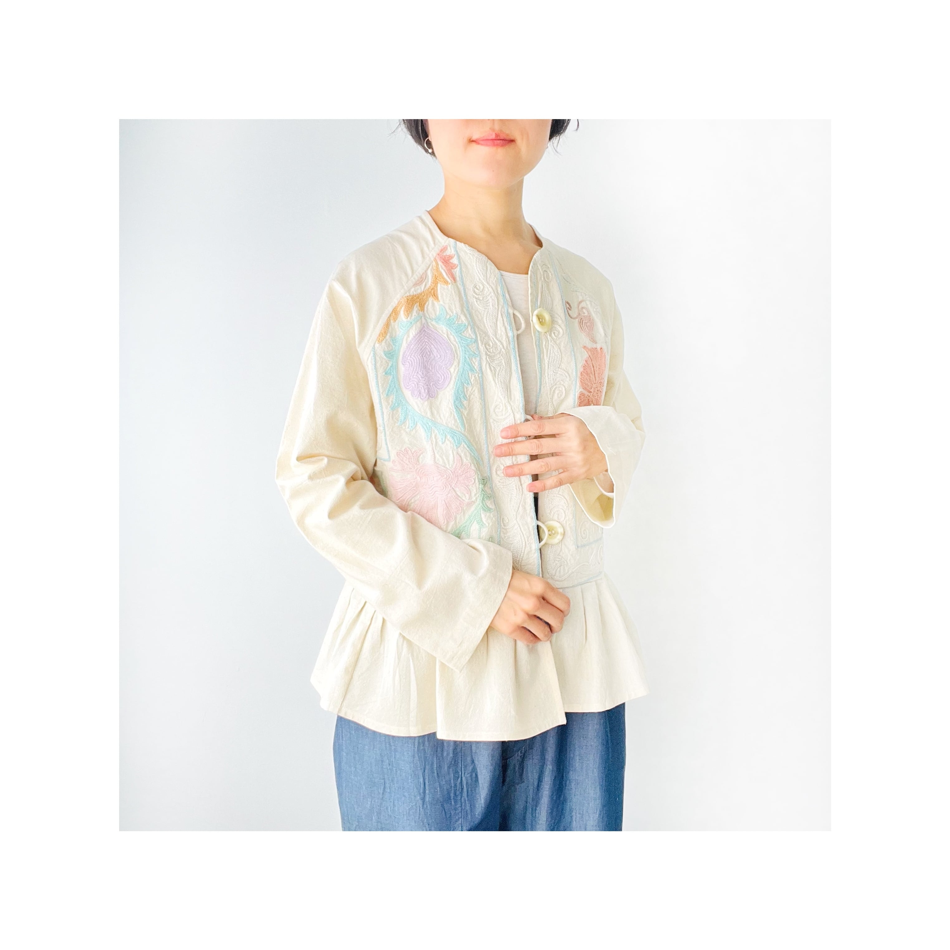 手刺繍スザニ生地に、袖と裾のギャザーは無地の生地を使用して軽くて使いやすい1着に仕上がりました。