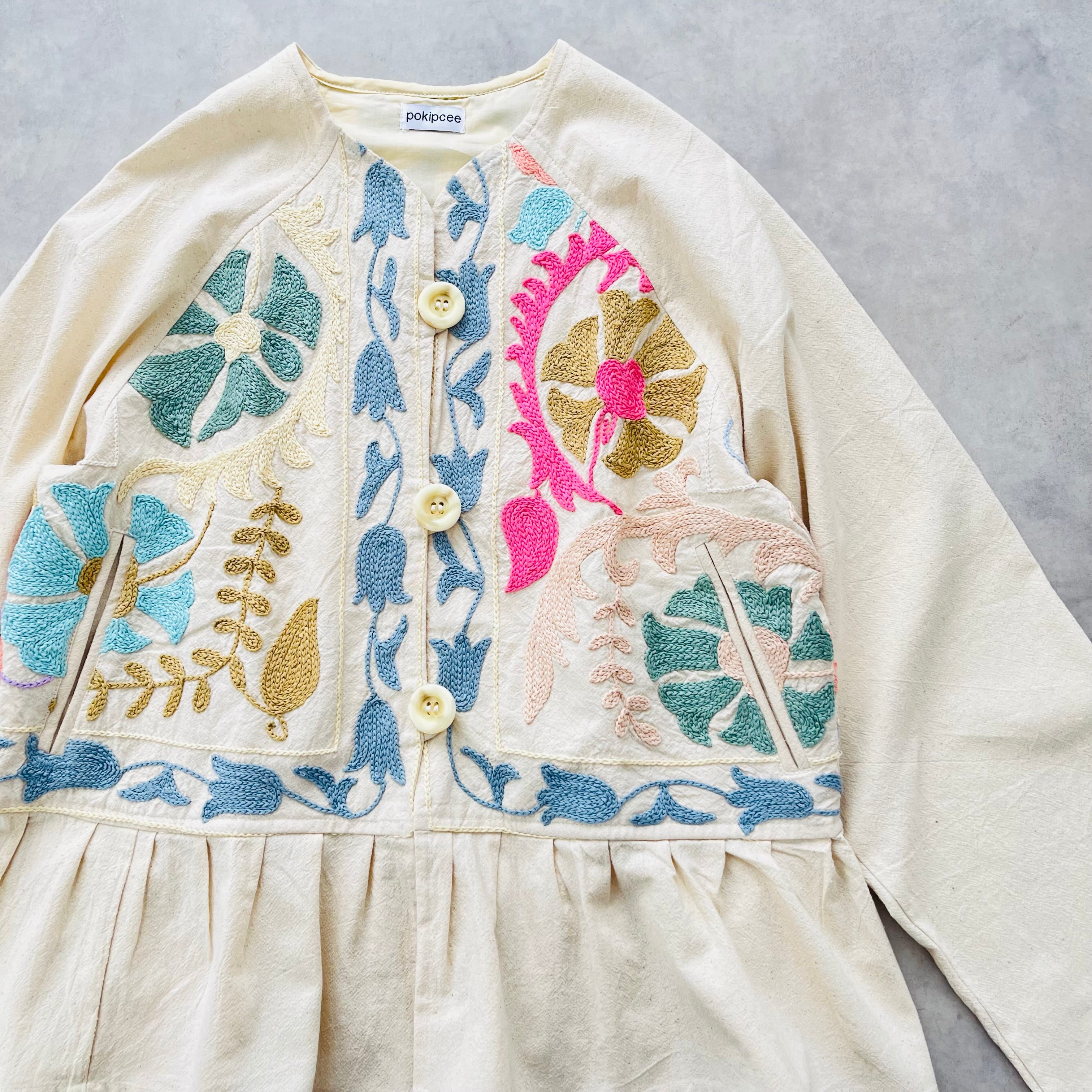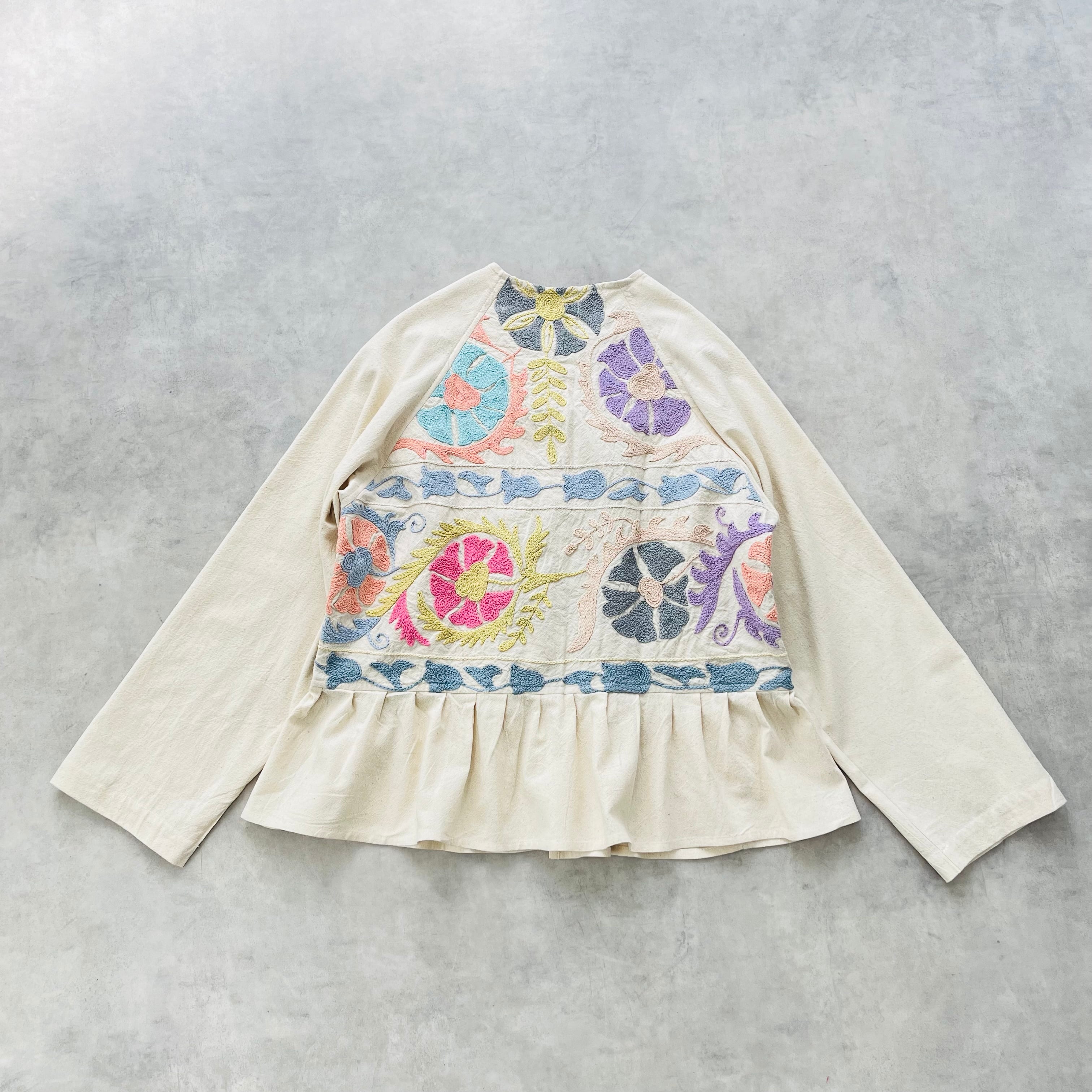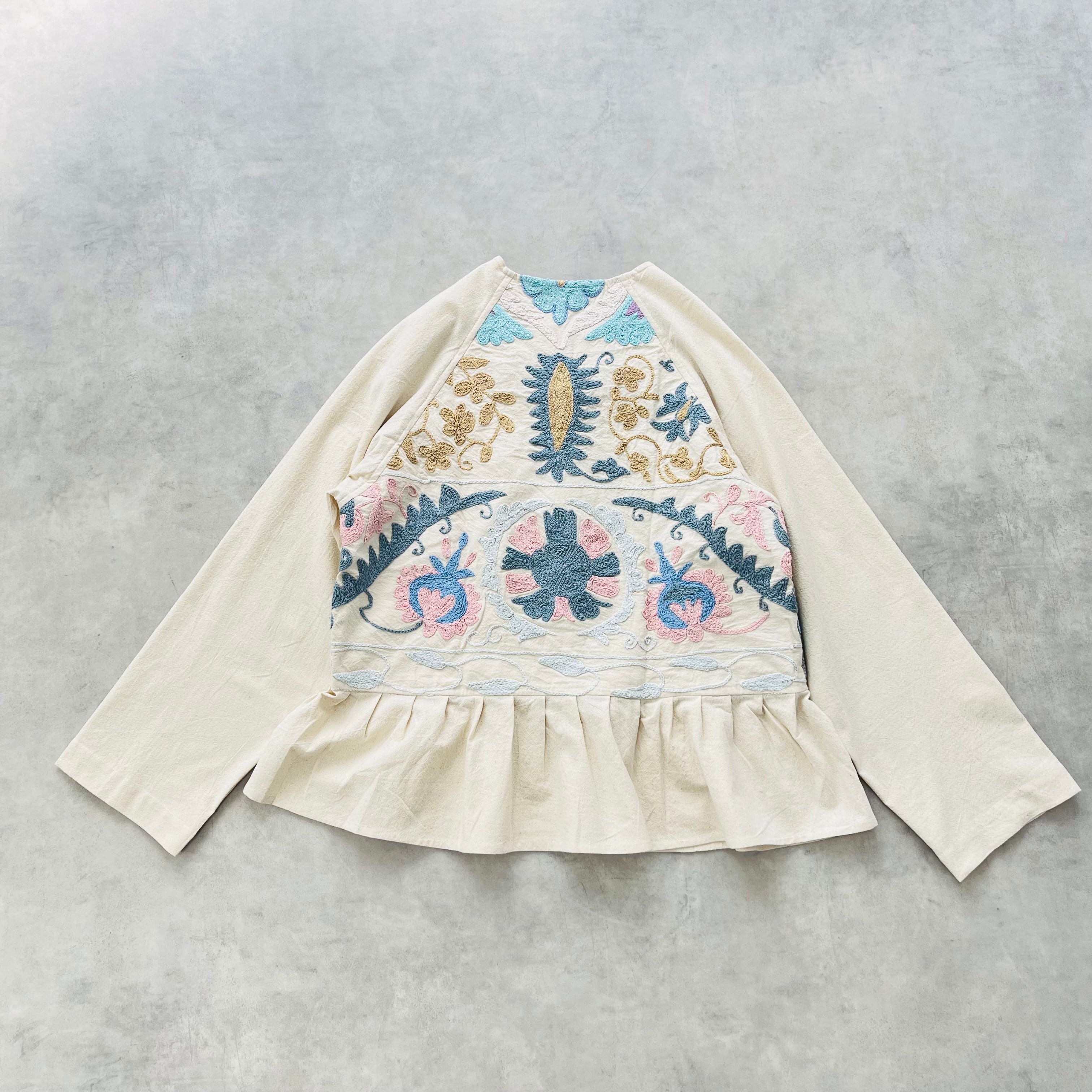 手刺繍スザニ生地に、袖と裾のギャザーは無地の生地を使用して軽くて使いやすい1着に仕上がりました。