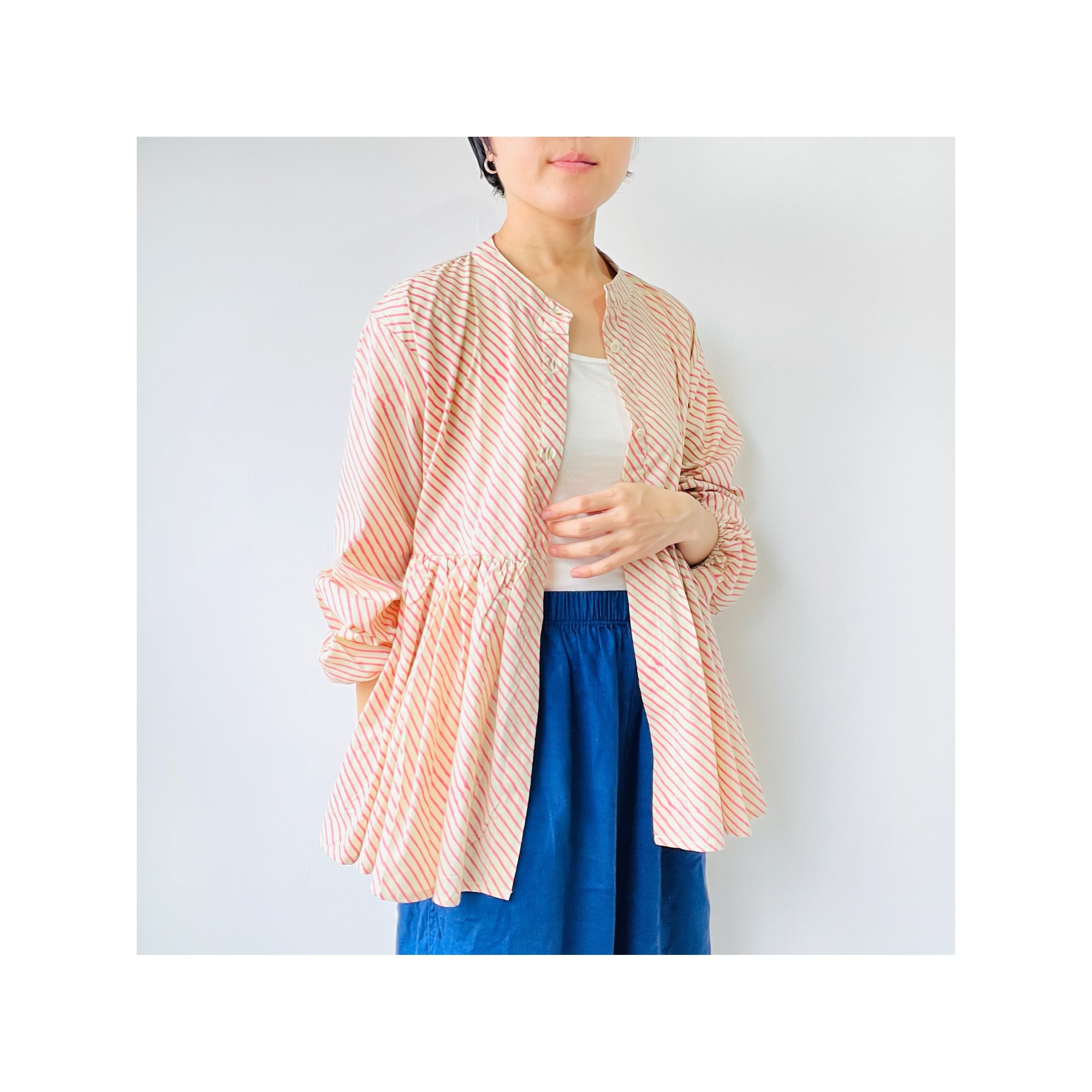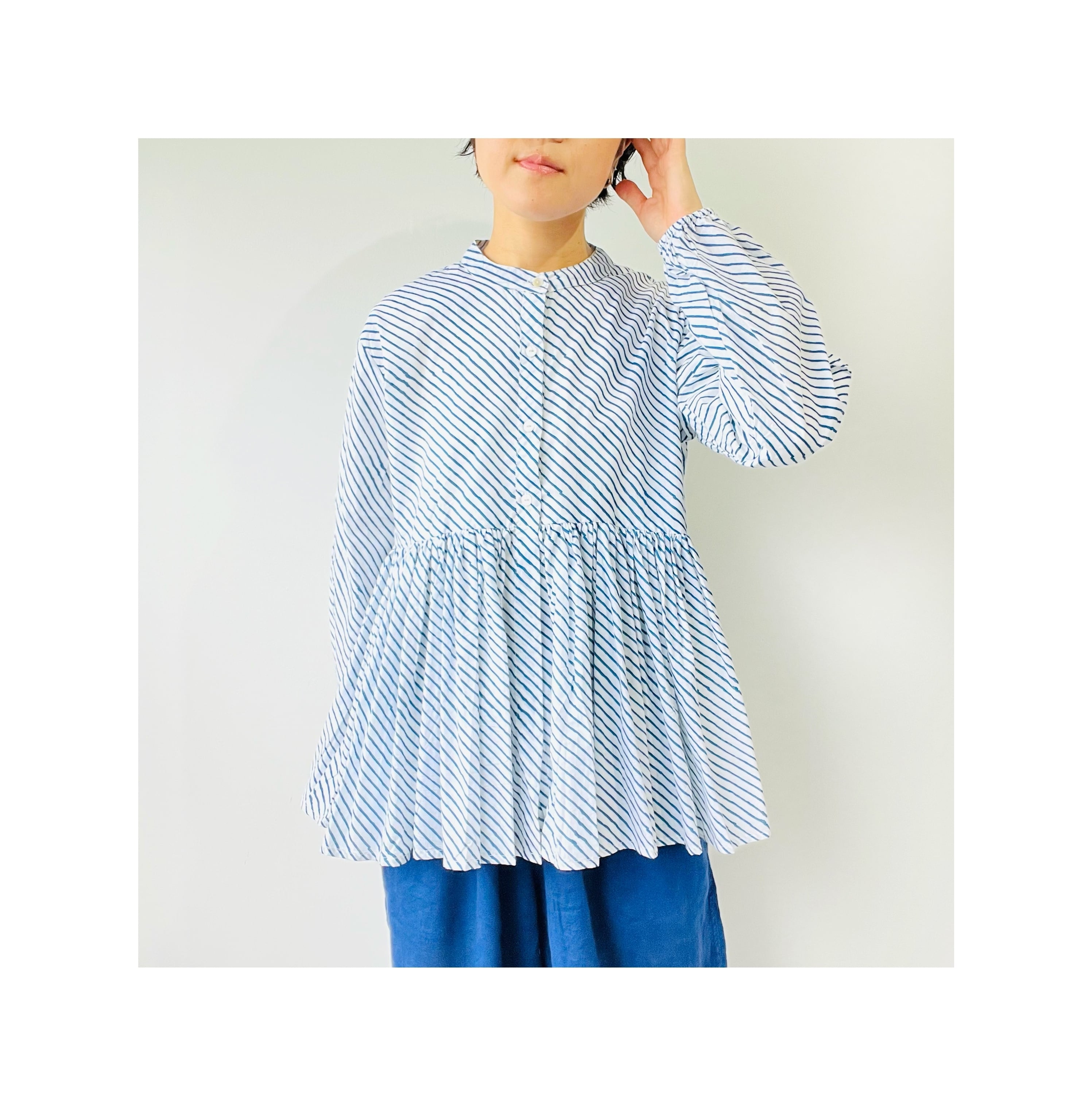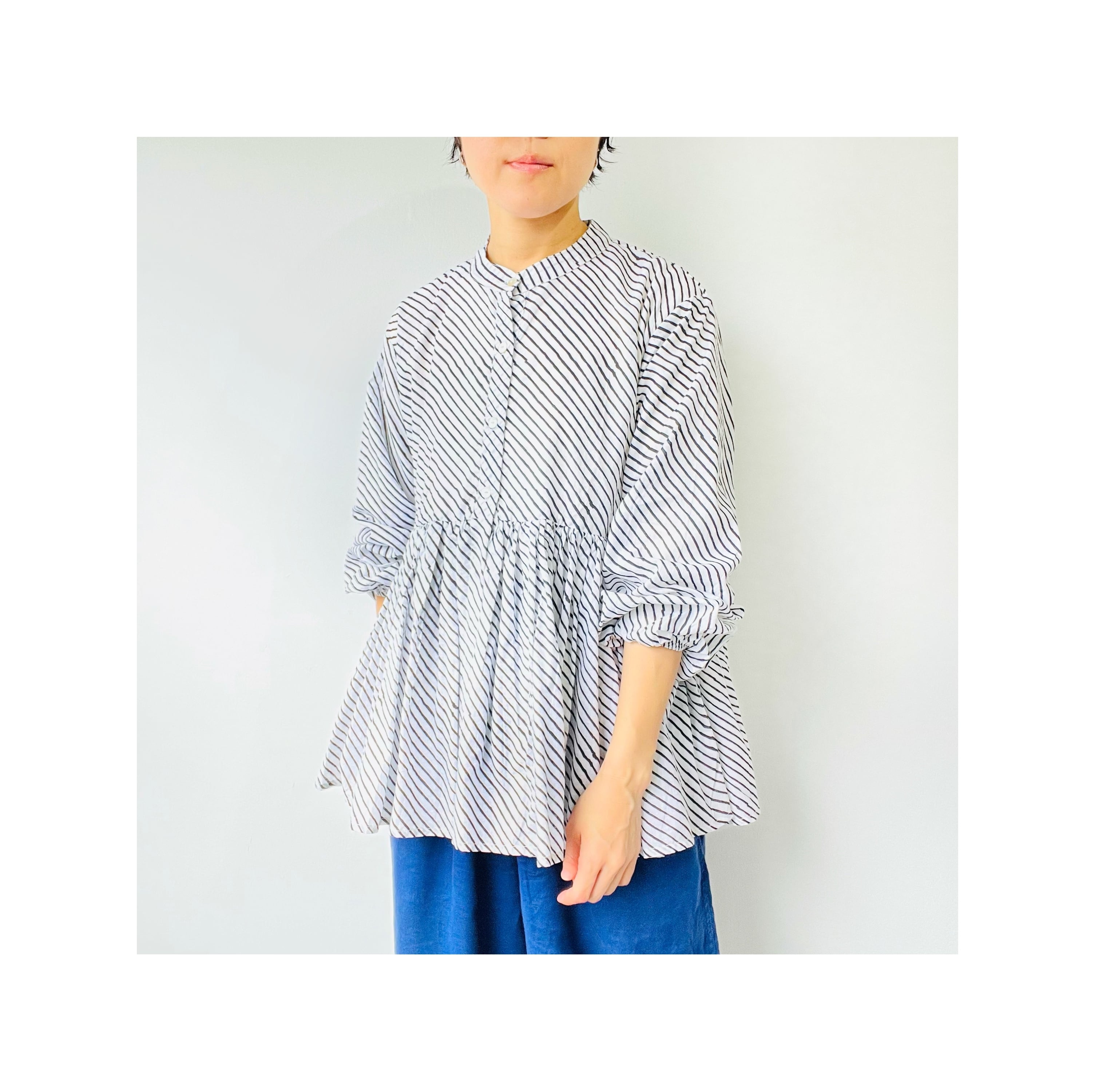 珍しい斜めストライプの生地でギャザーたっぷりシャツを作りました。