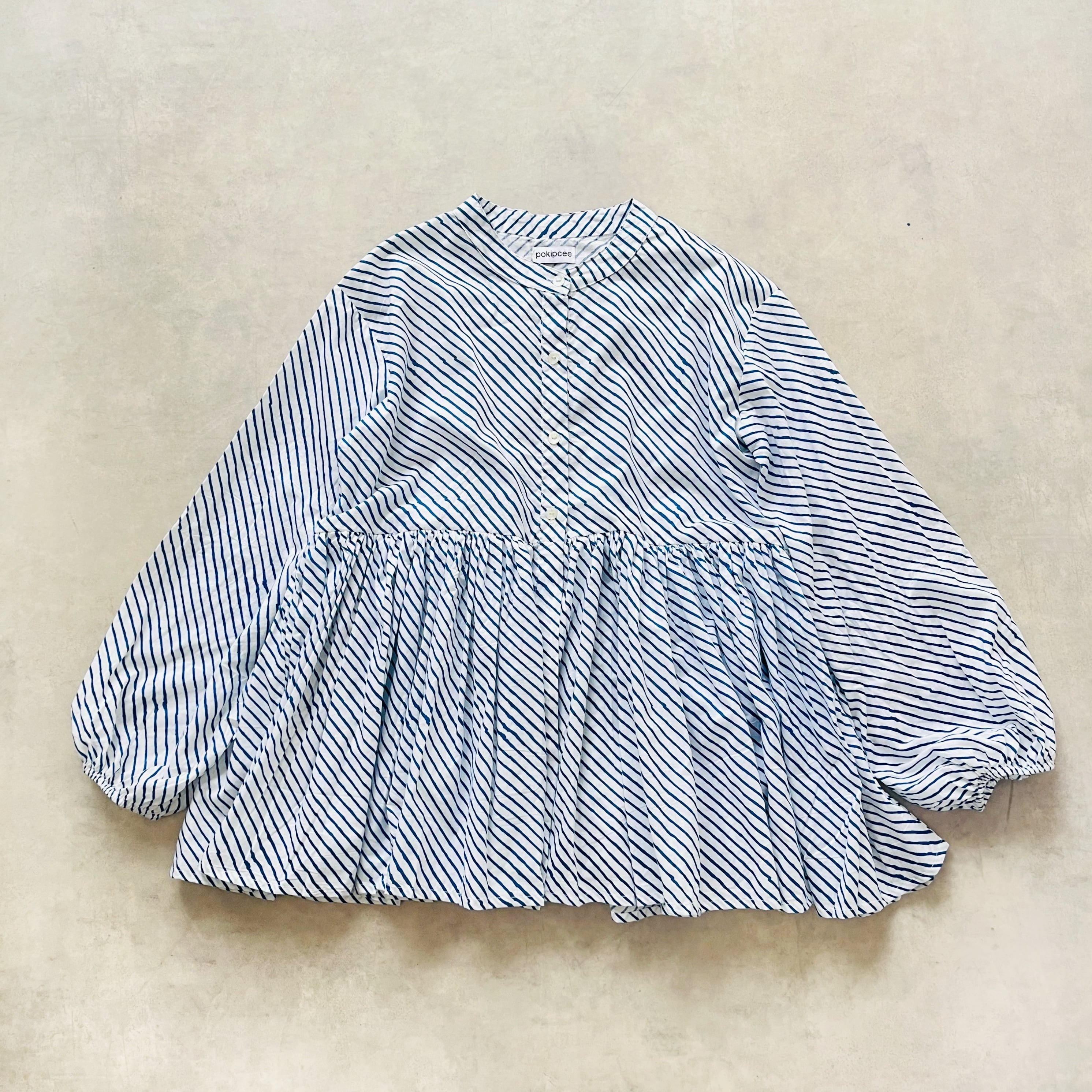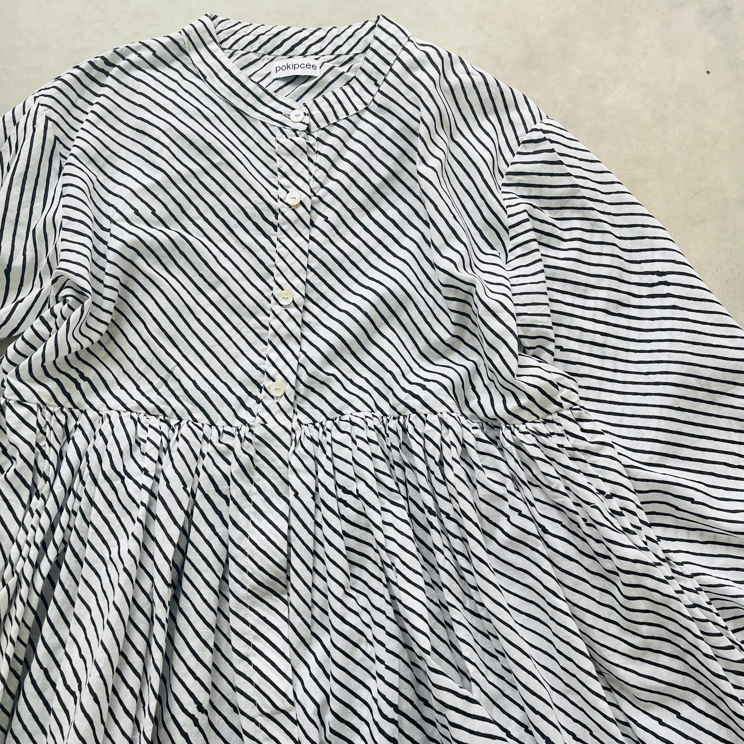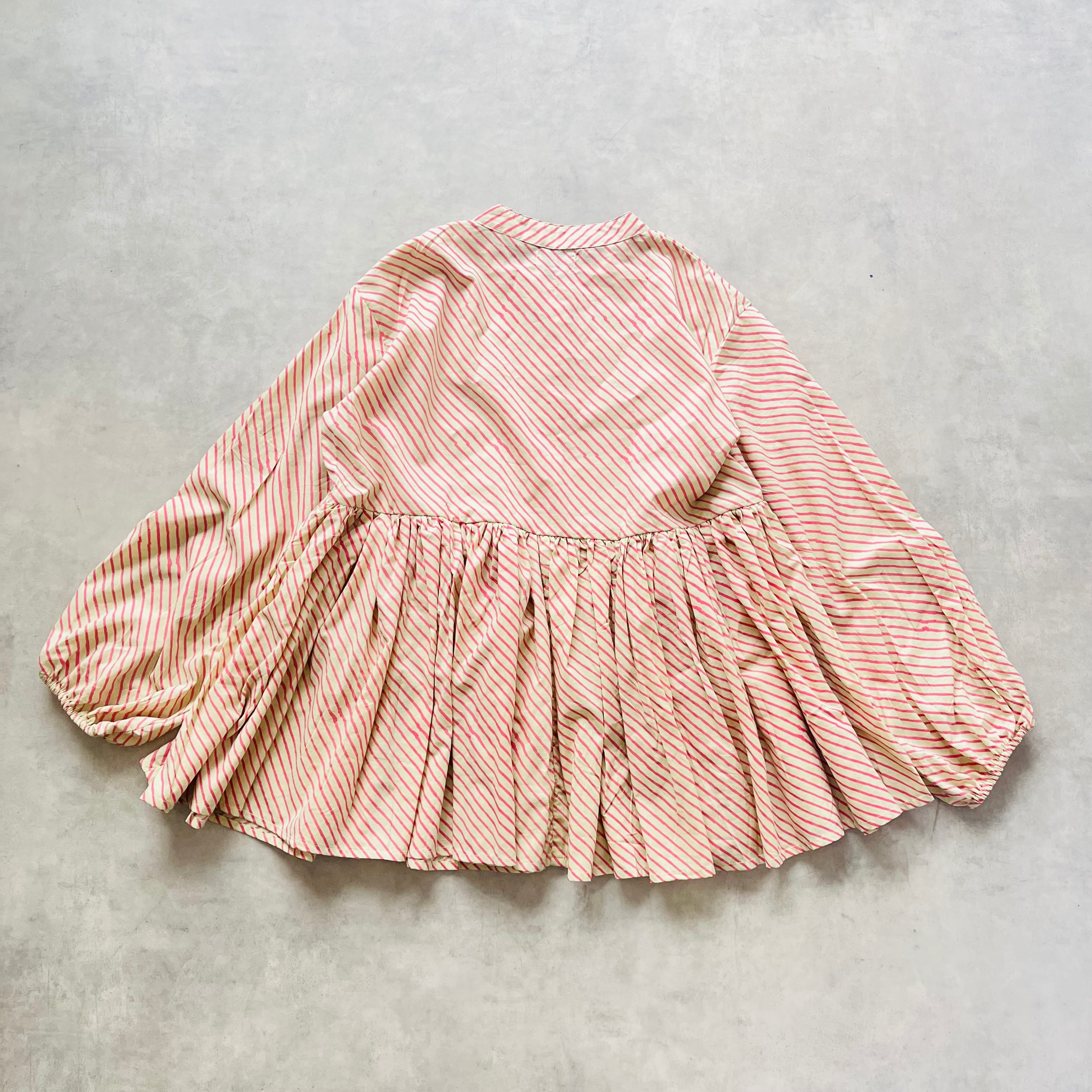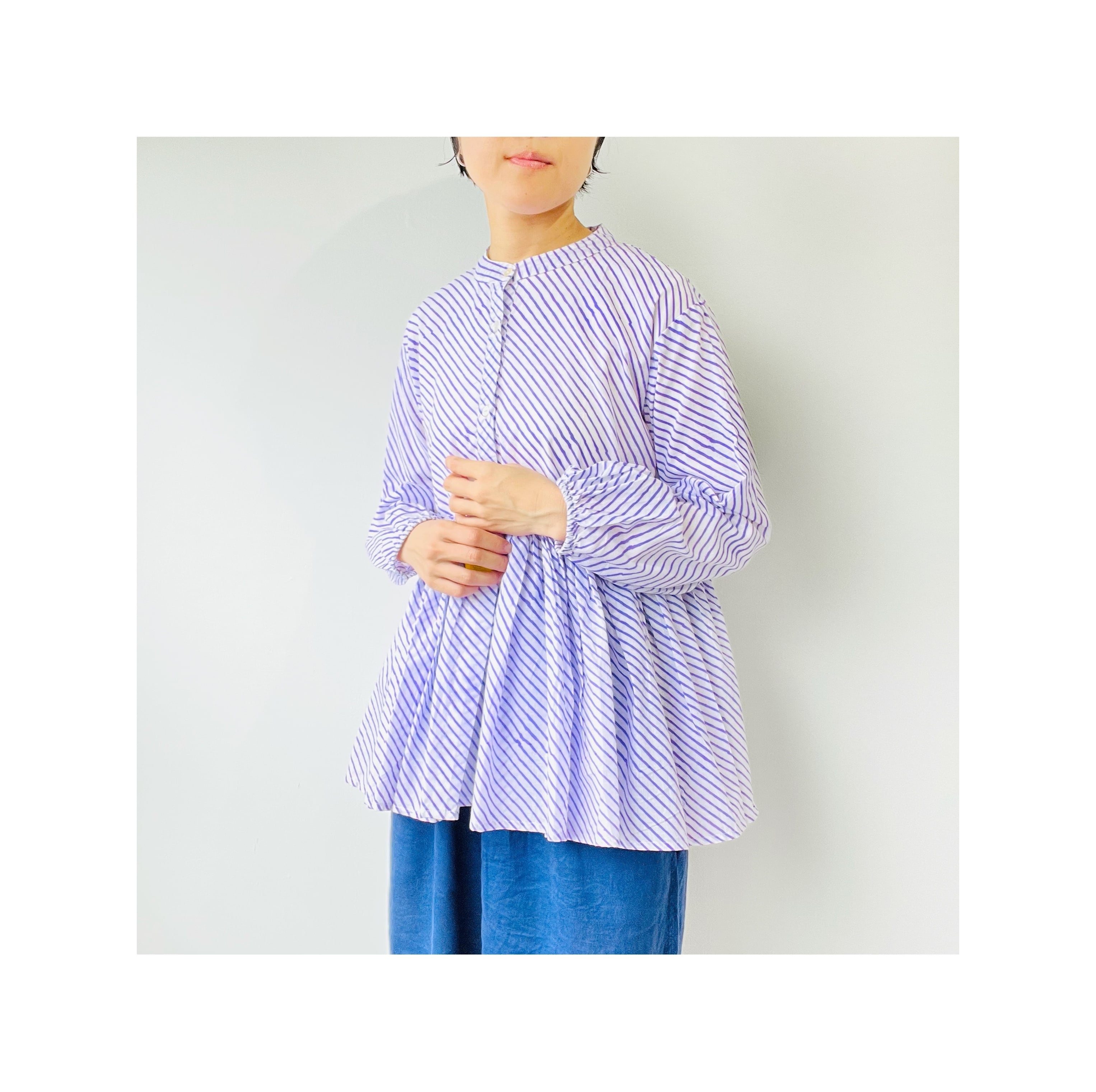 珍しい斜めストライプの生地でギャザーたっぷりシャツを作りました。